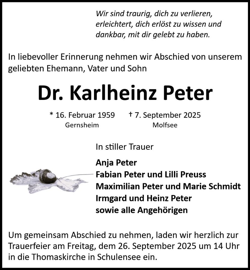 Mit großer Bestürzung habe ich vom Tod von Karlheinz Peter erfahren.